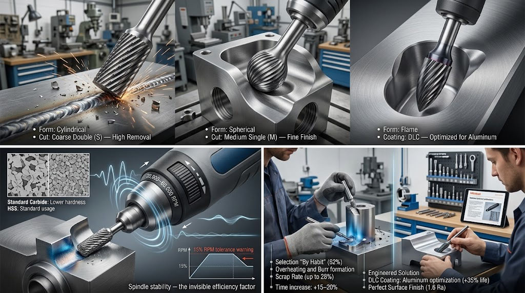 Отдельного внимания заслуживает тип насечки. Крупная насечка увеличивает съем материала, но оставляет грубую поверхность. Мелкая — наоборот, обеспечивает чистоту, но снижает производительность. Американская ассоциация SME (Society of Manufacturing Engineers) подчеркивает, что оптимальный баланс достигается только при учете твердости материала и скорости вращения инструмента.