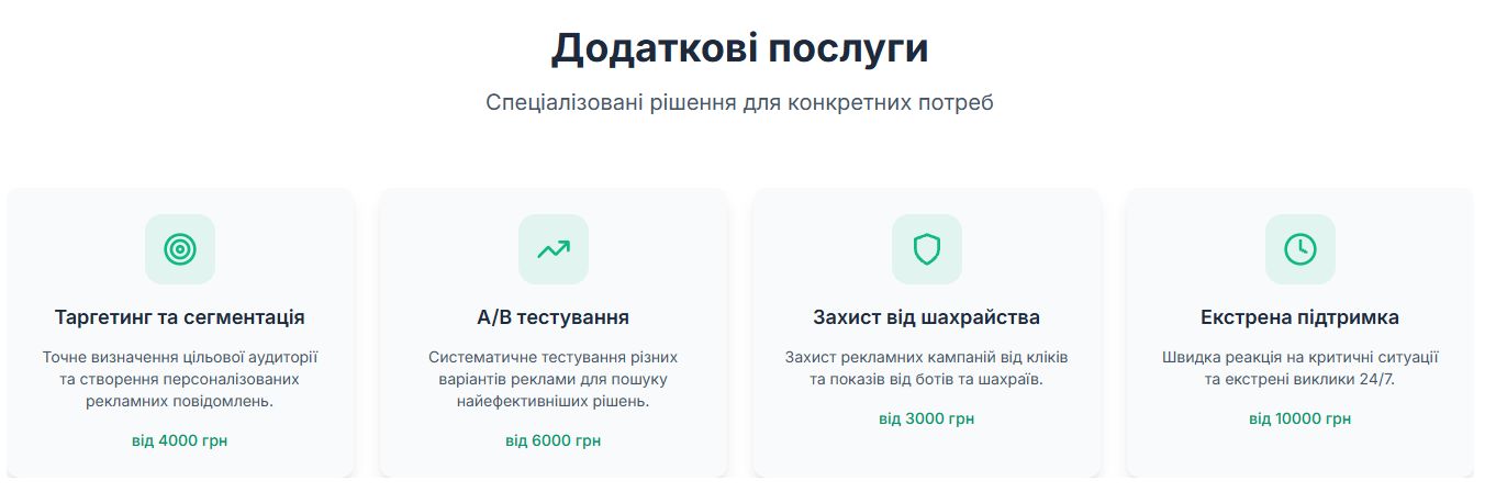 | Робочі ніші | E-commerce, SaaS, нерухомість, послуги |