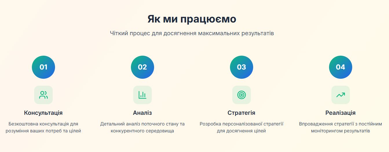 | Результативність | Зменшення CPC до –45%, збільшення CTR до +80% |